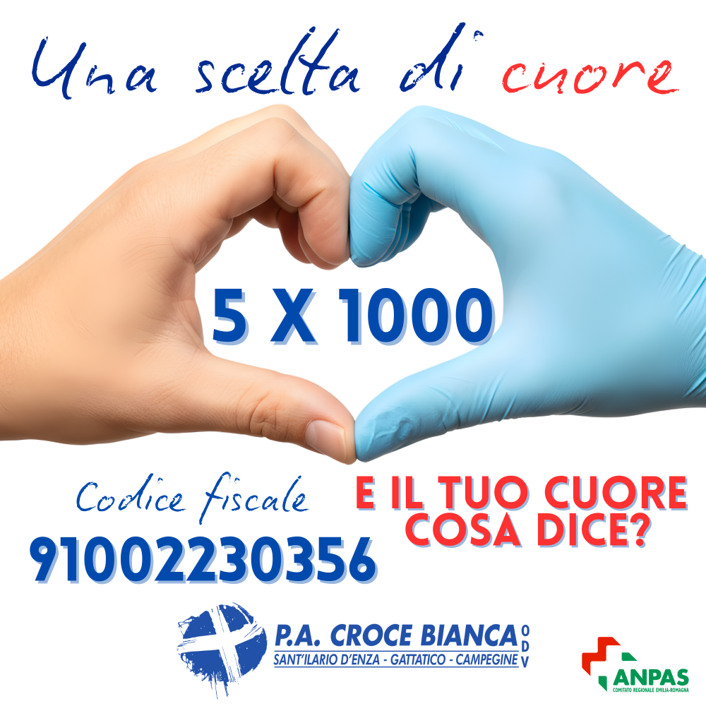 Donare il 5×1000 a Croce Bianca Sant’Ilario · Gattatico · Campegine non costa nulla È un gesto semplice ma molto importante per sostenere l’assistenza pubblica a beneficio di tutta la comunità.
