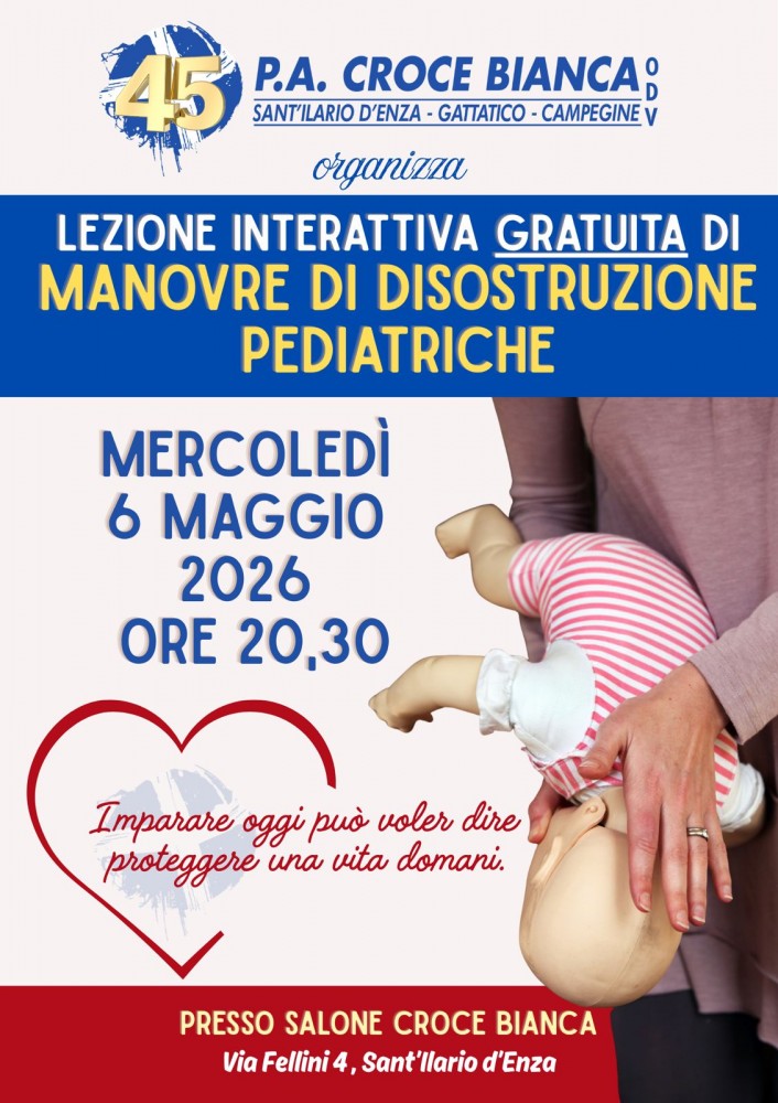 Mercoledì 6 maggio alle ore 20.30, presso il Salone Croce Bianca in Via Fellini 4, Sant’Ilario d’Enza, si terrà una lezione interattiva gratuita di manovre di disostruzione pediatrica.