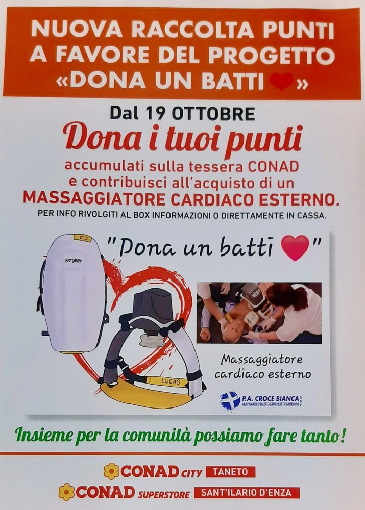 Non prendere impegni SABATO 19.10 alle 10.30 ti aspettiamo al Conad Superstore di Sant'Ilario d'Enza per l'inaugurazione della nuova raccolta punti accumulati durante la spesa sulla tessera soci Conad a sostegno del progetto " DONA UN BATTI " per l'acquisto di un massaggiatore cardiaco esterno... a seguire un piccolo buffet